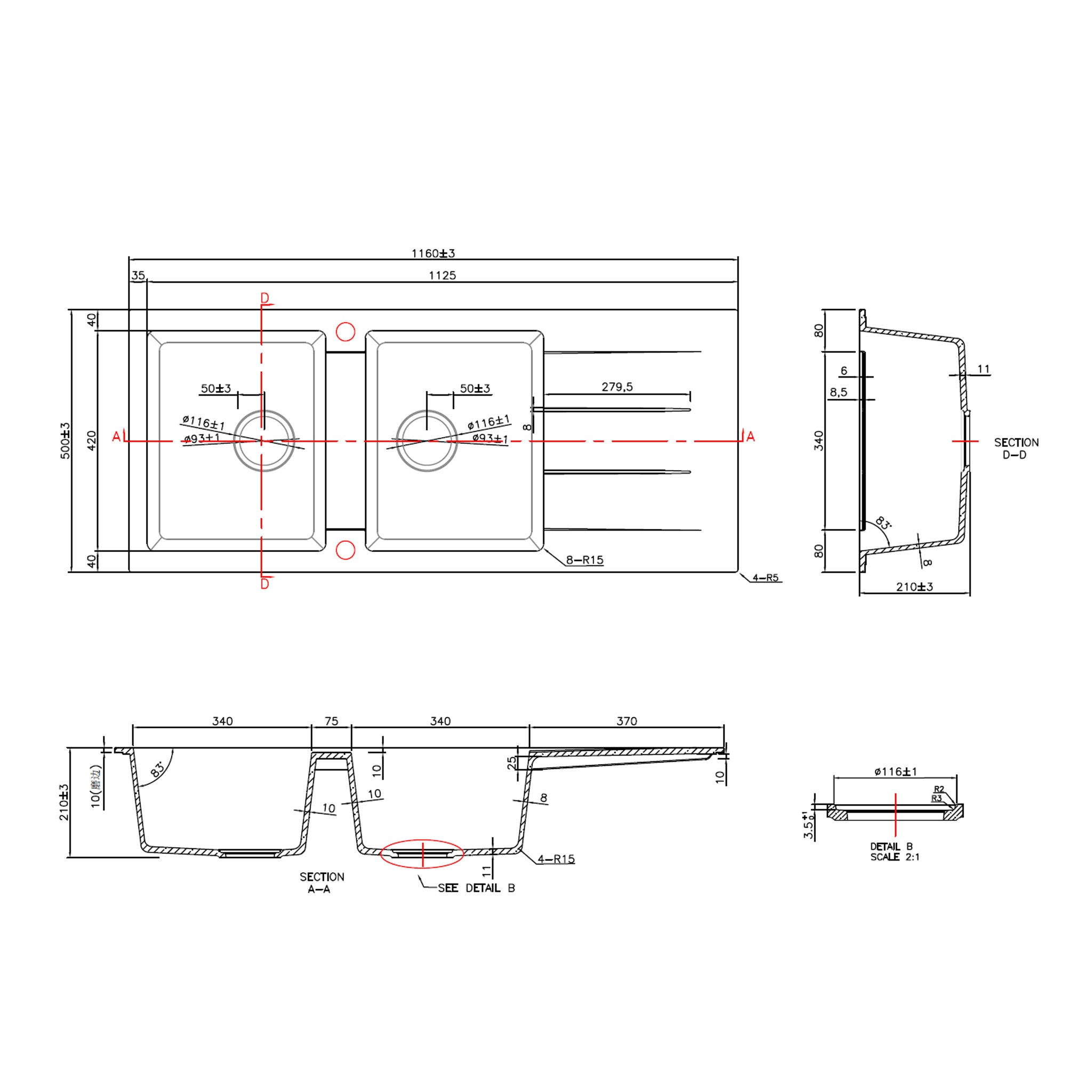 Coral Granite Sink Double Bowl with drainer 1160x500x210