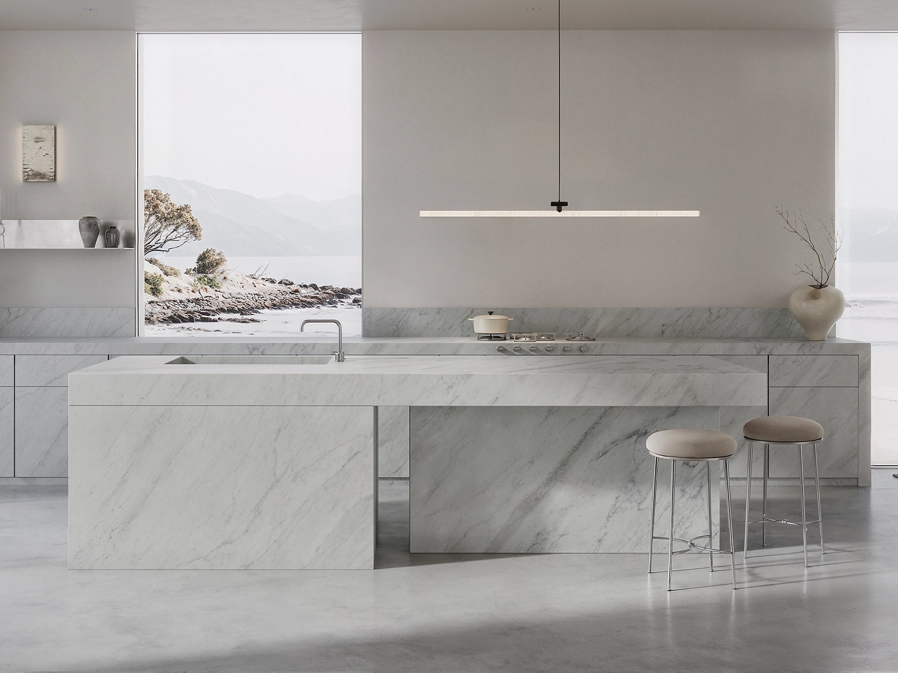 Featuring a cool, pearly white background with delicate veins, this new surface is a recreation of the famous and iconic Carrara marble in a durable sintered stone.