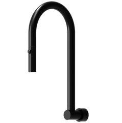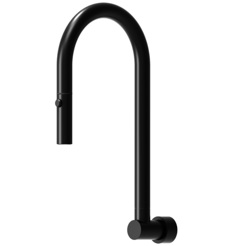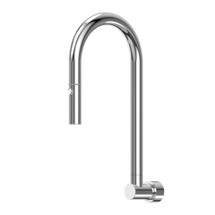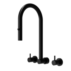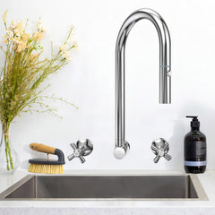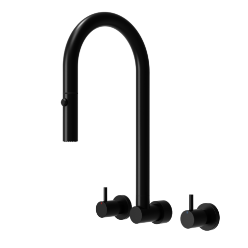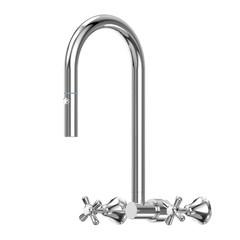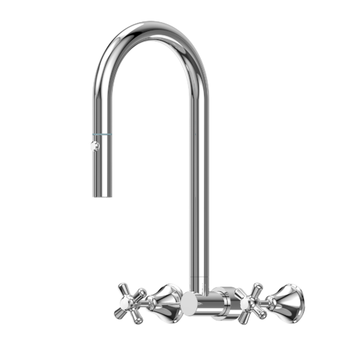 The wall spout has a pull out and retractable hose with a rotating ball joint, dual spray nozzle.